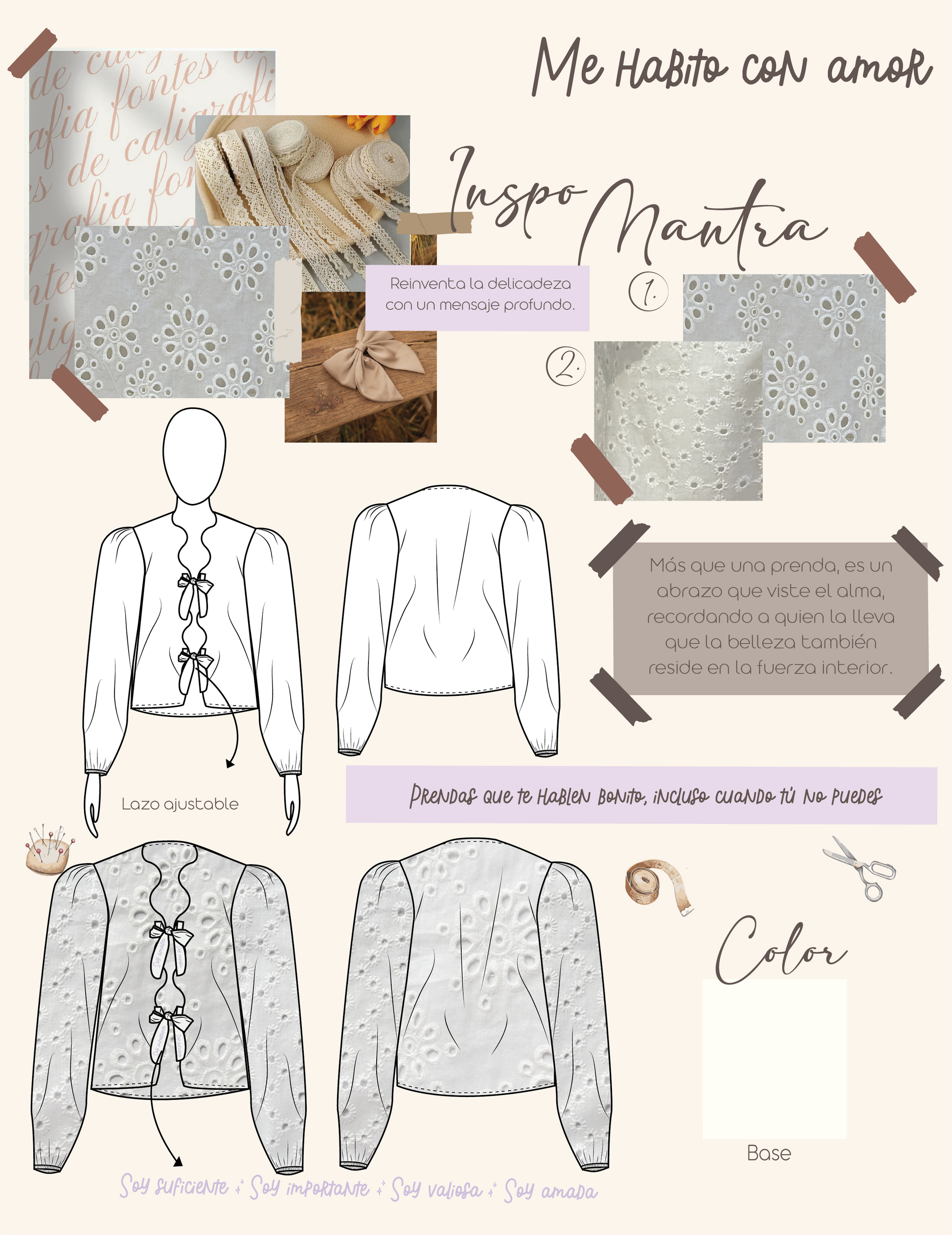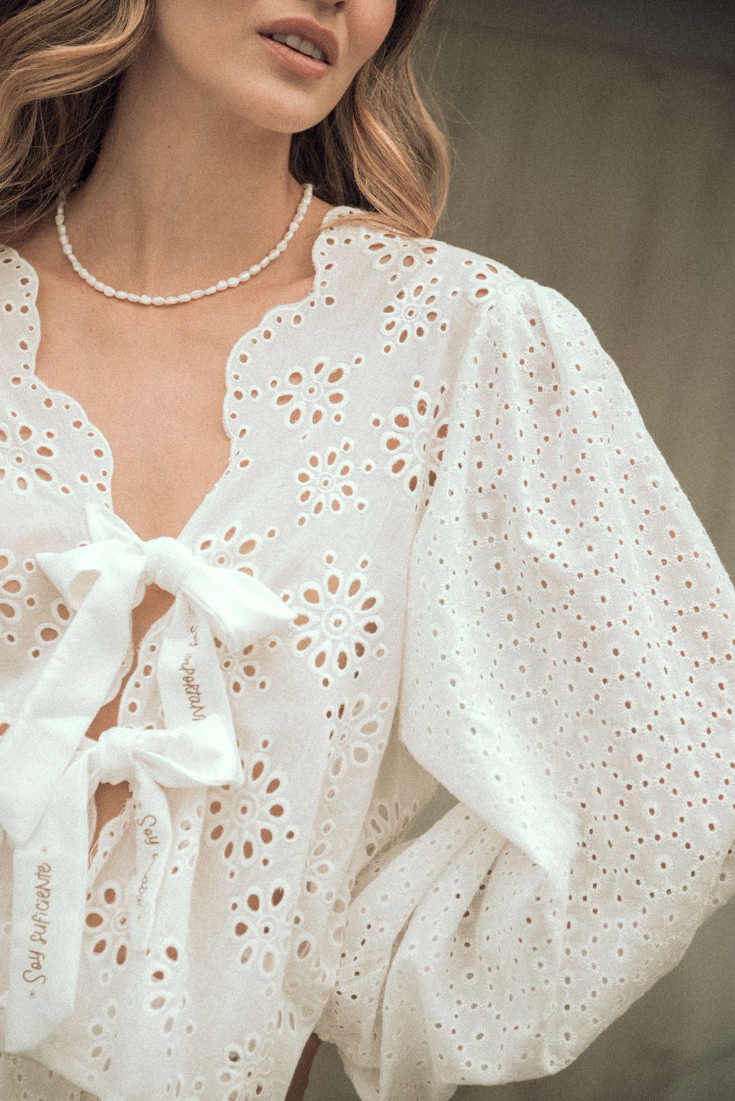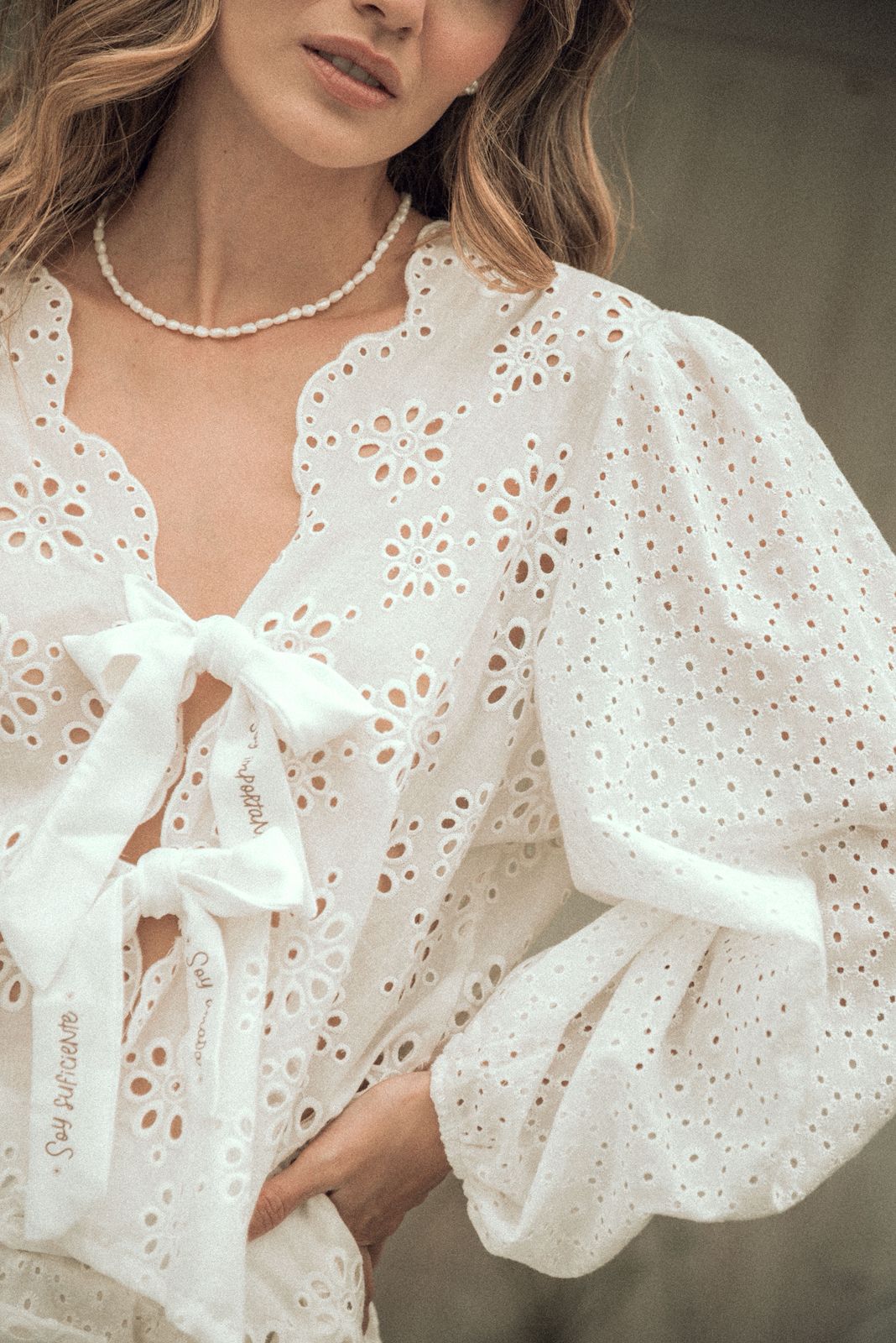 Set de ojalillo, 100% algodón, blusa manga larga con lazos frente estampados con frases: soy su ciente, soy valiosa, soy amada. Falda short corta, con amarre ajustable al costado, pretina con resorte.