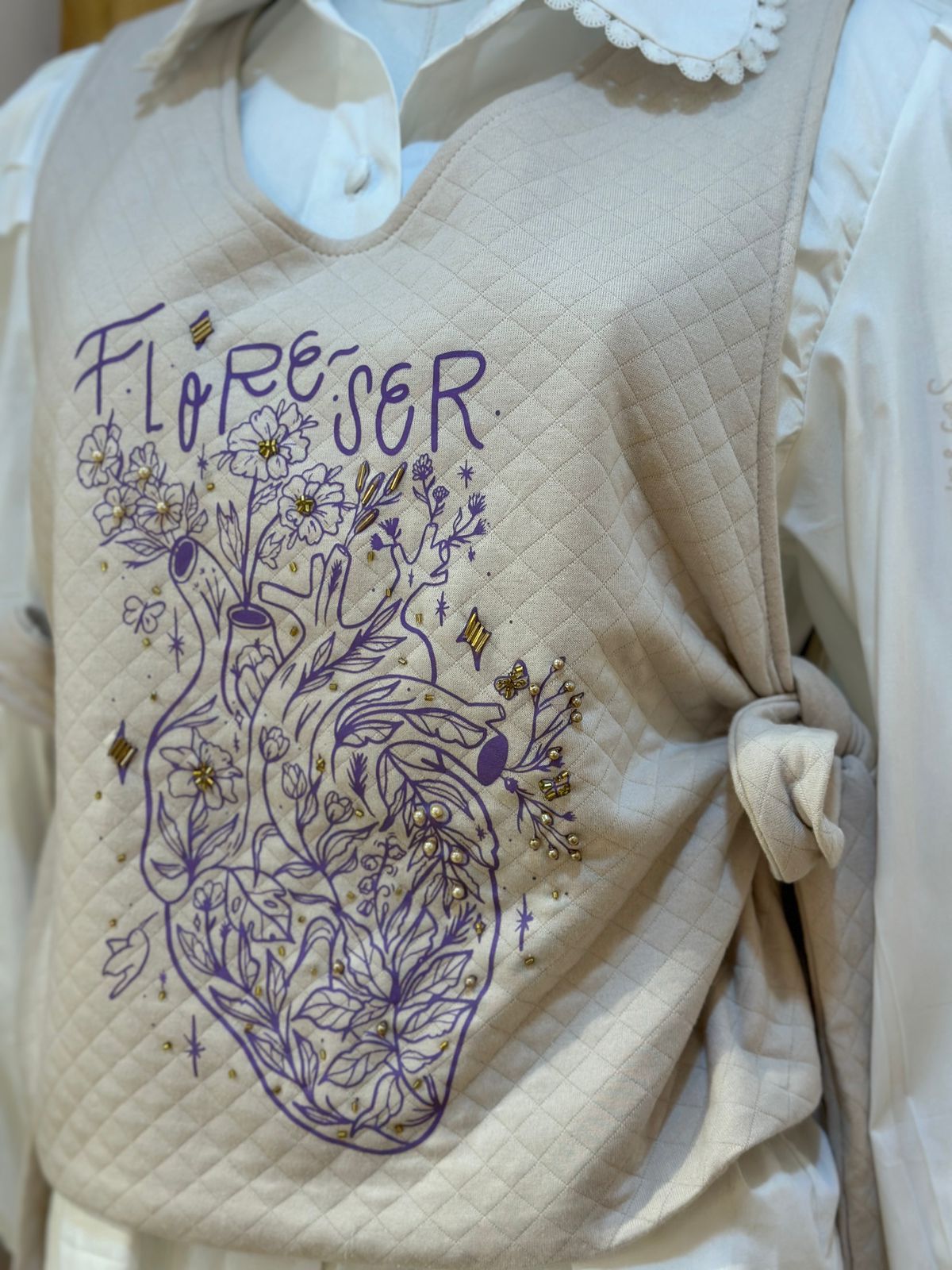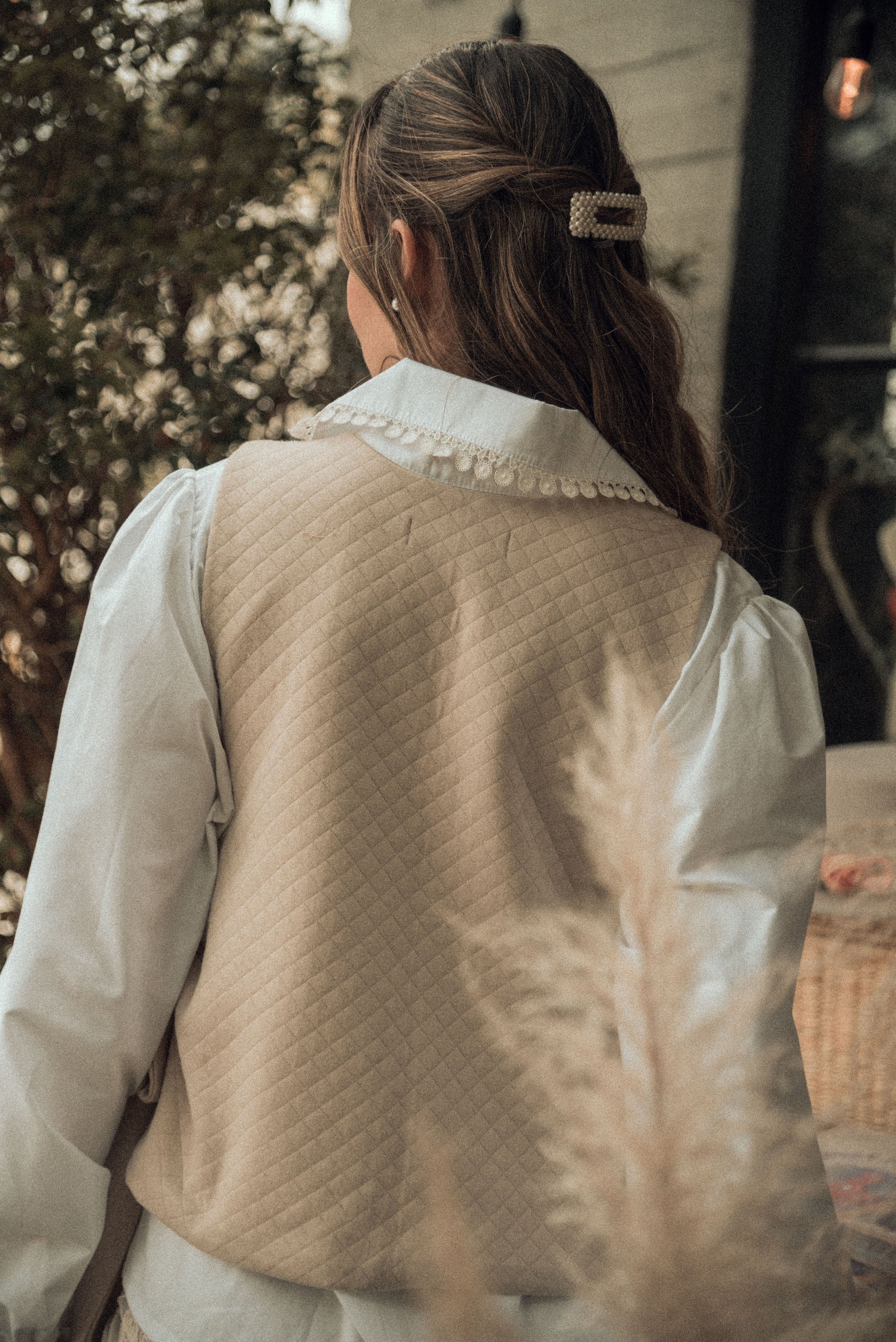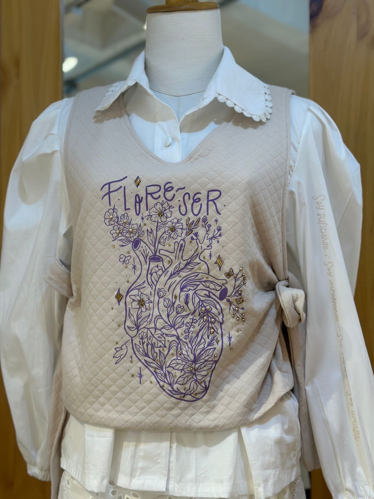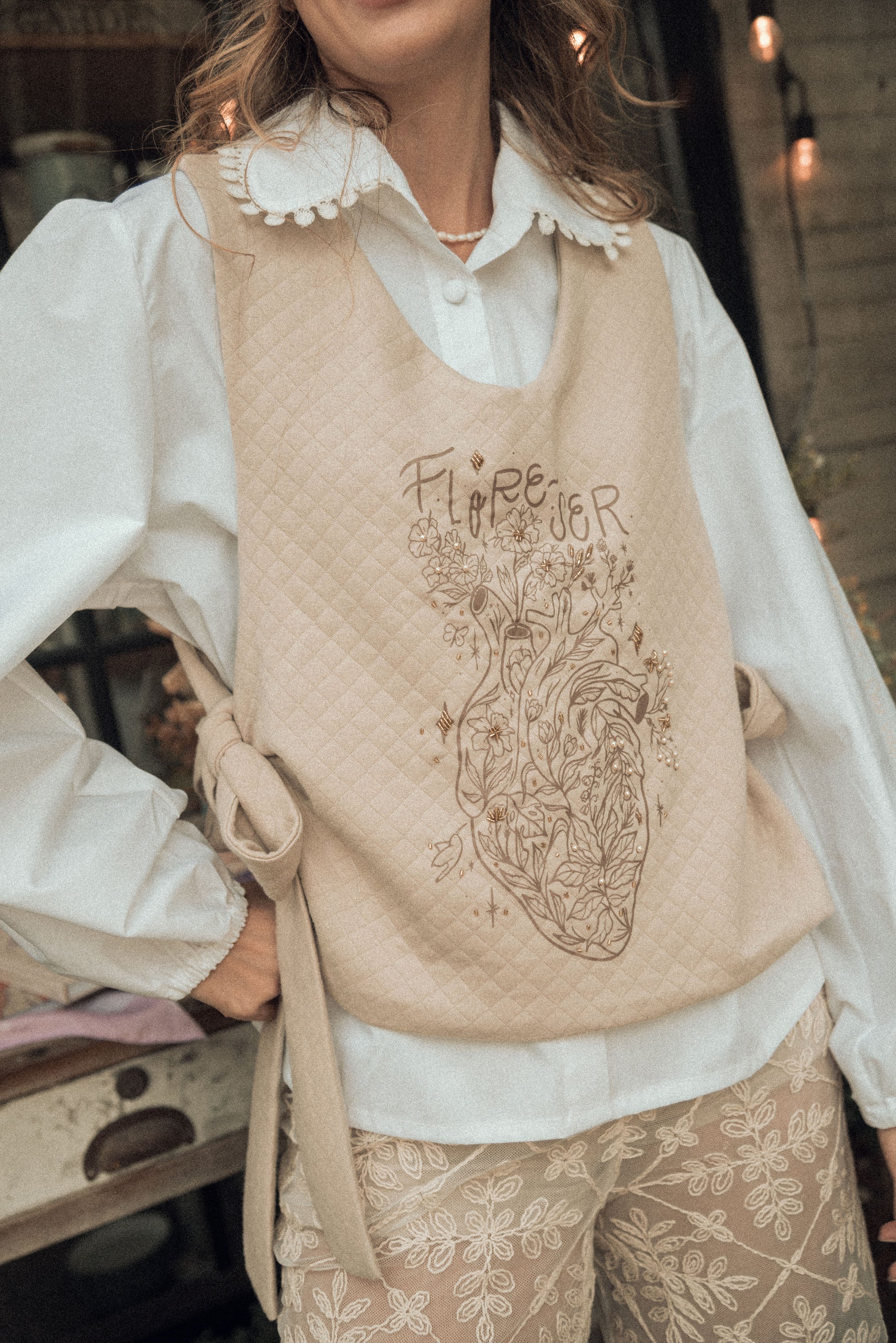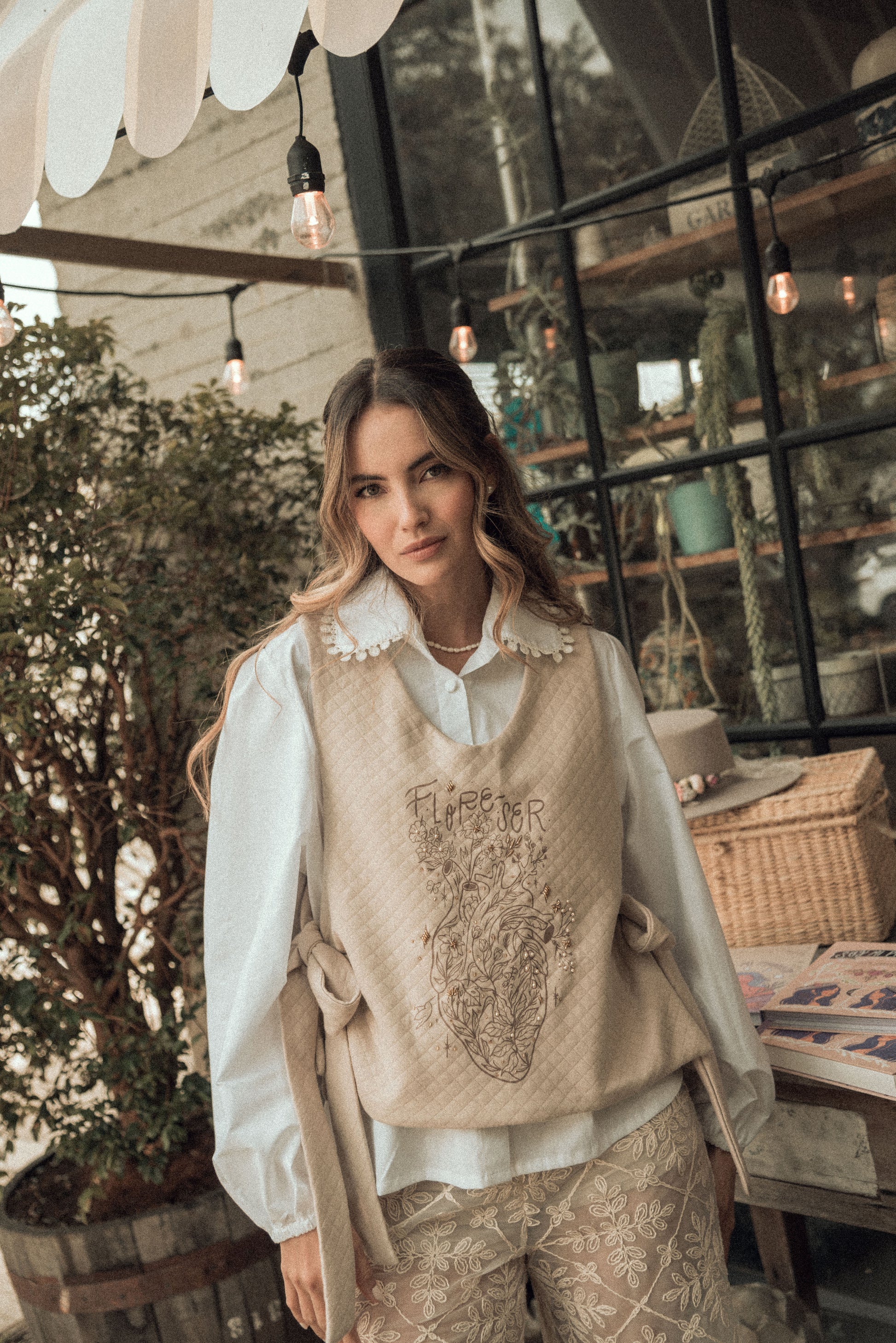Chaleco acolchado beige, estampado y detalles hechos a mano, lazos para amarre en los costados.