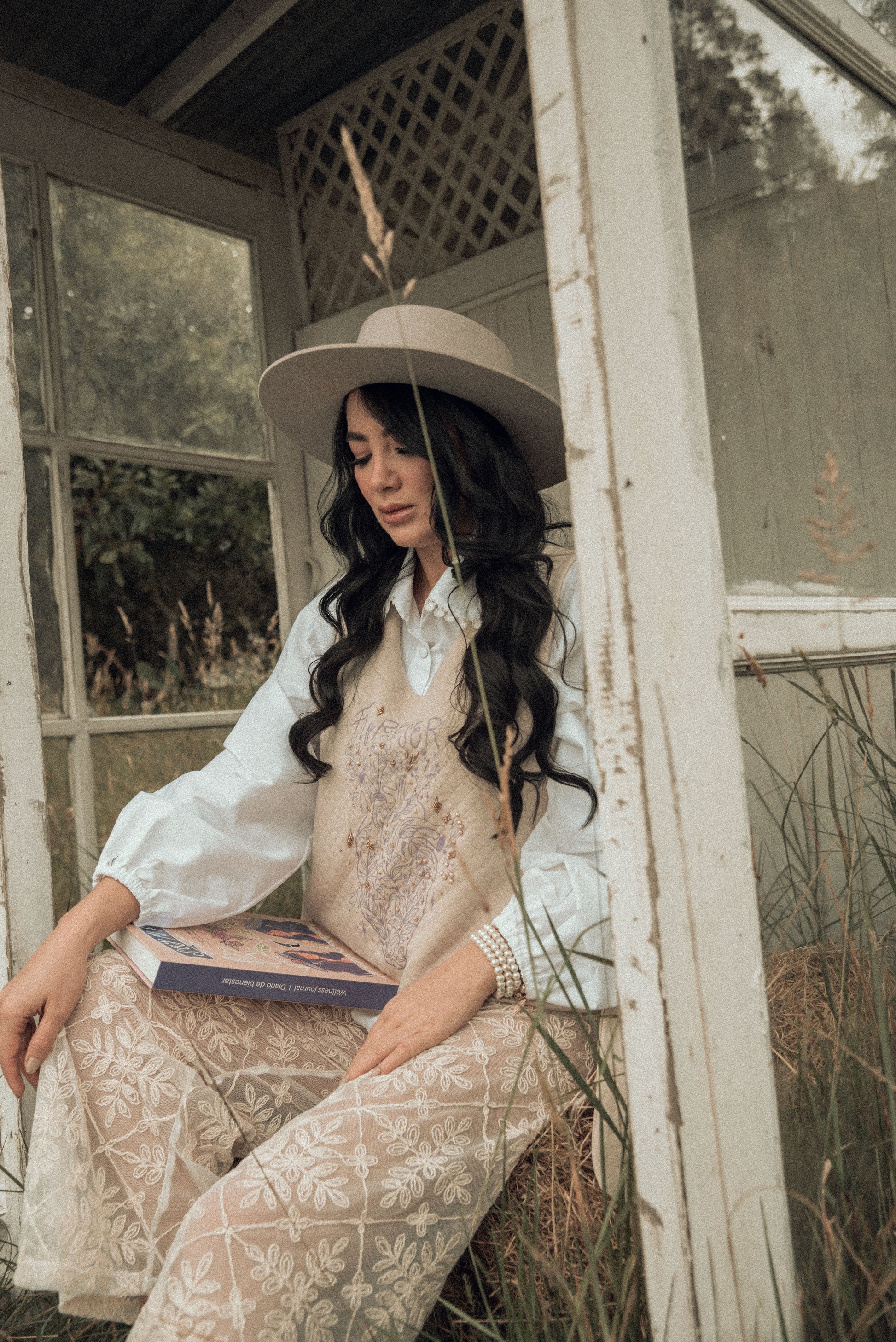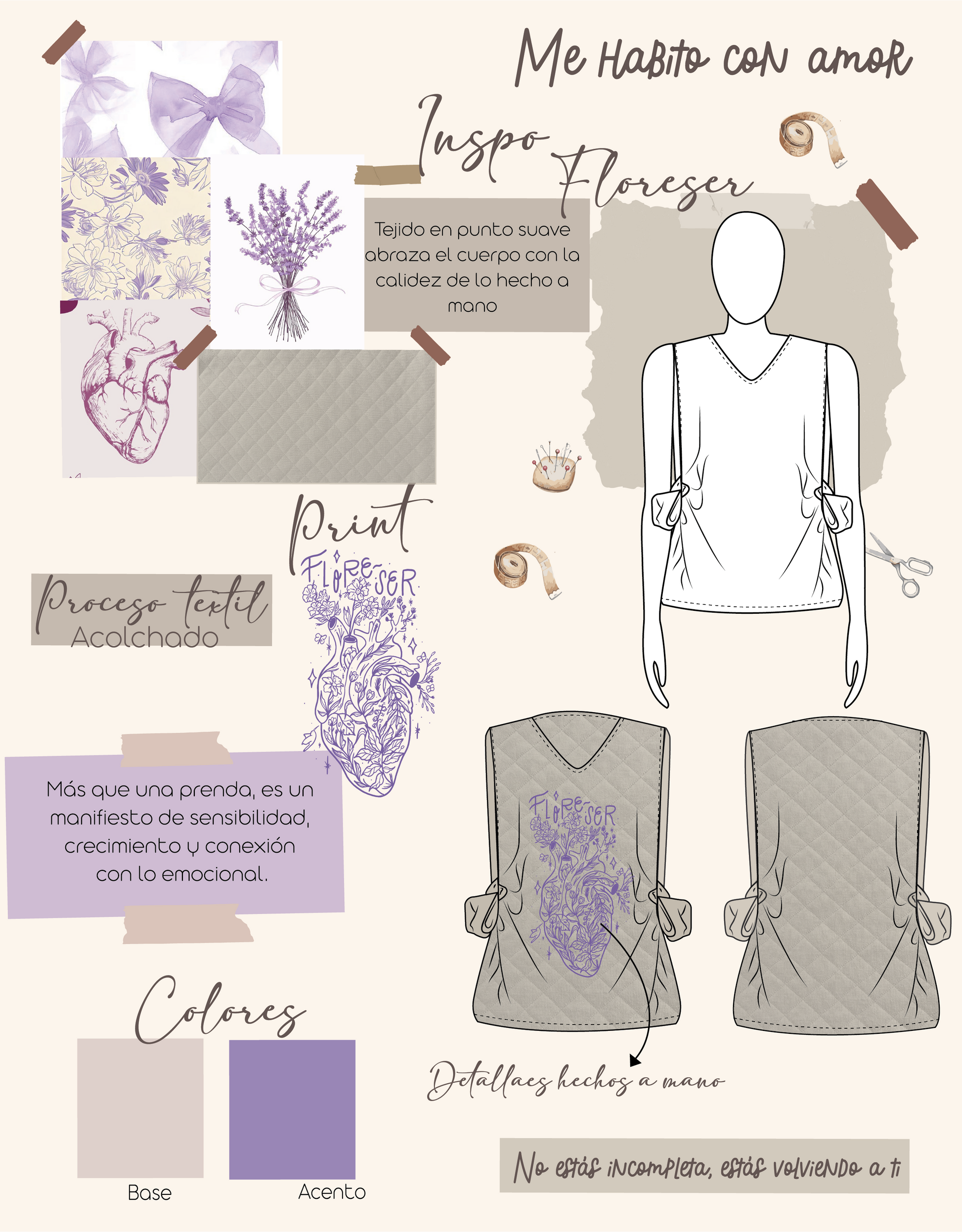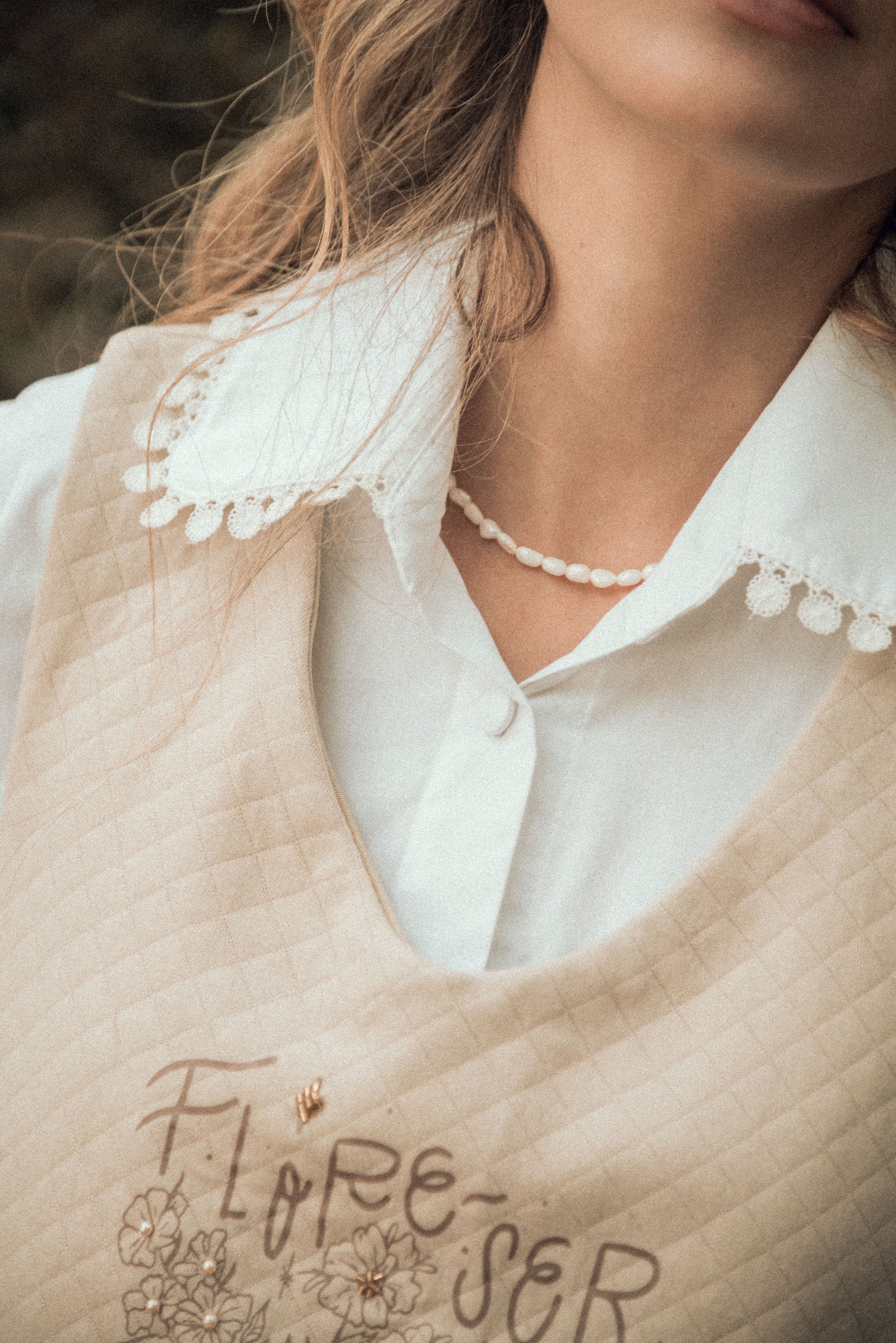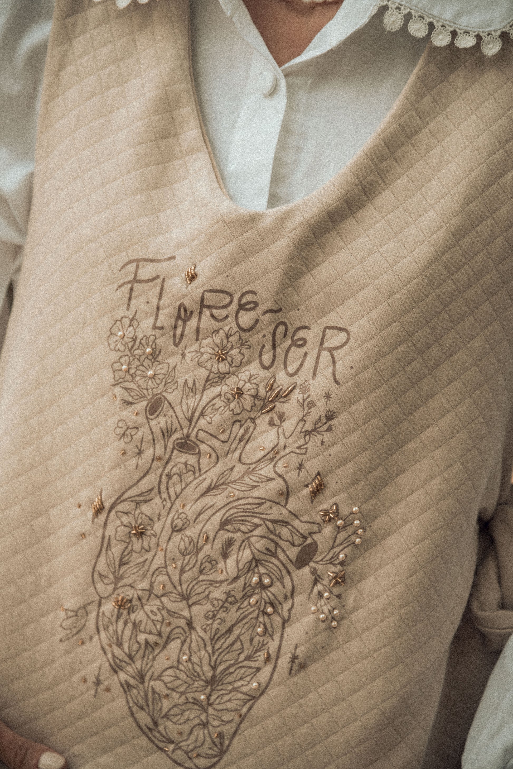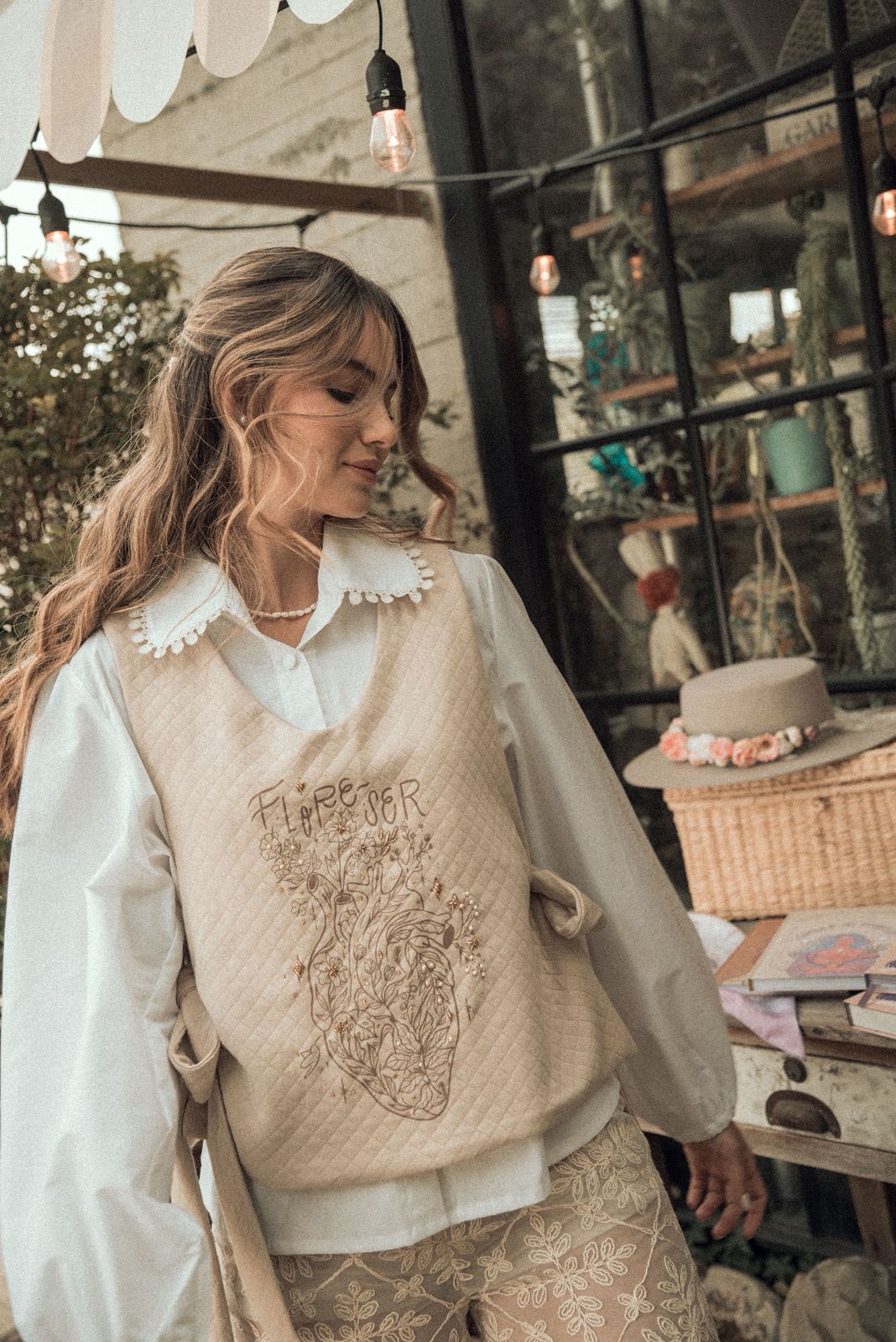 Chaleco acolchado beige, estampado y detalles hechos a mano, lazos para amarre en los costados.