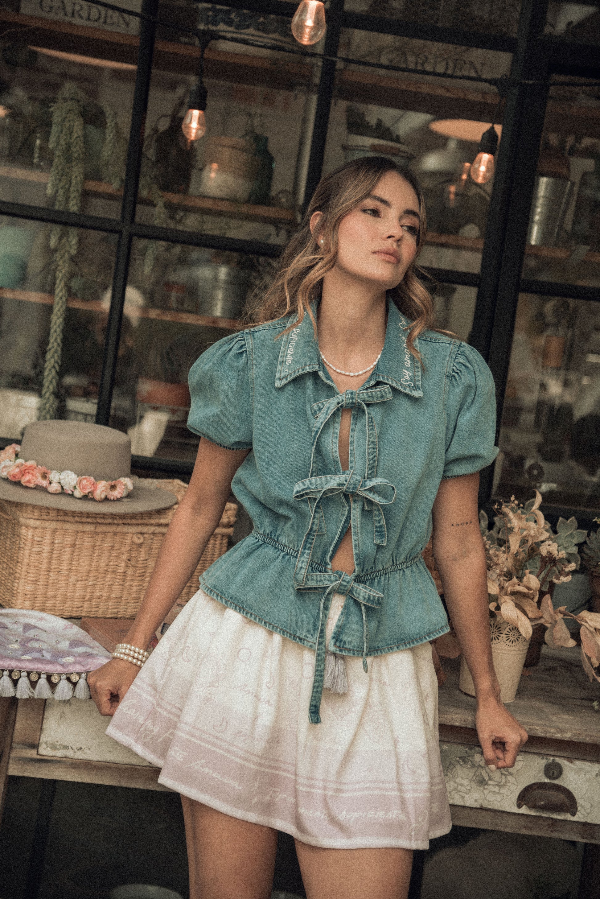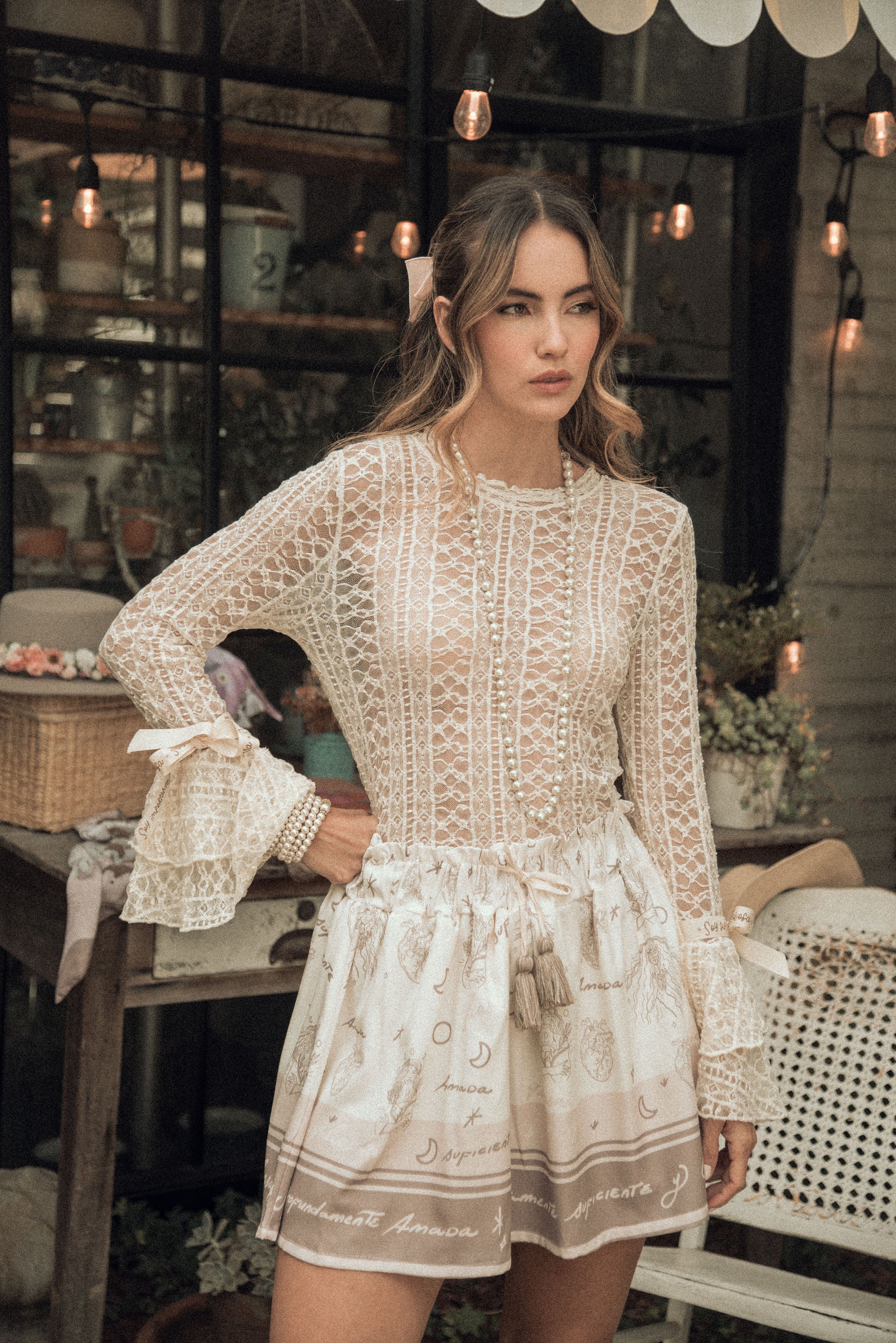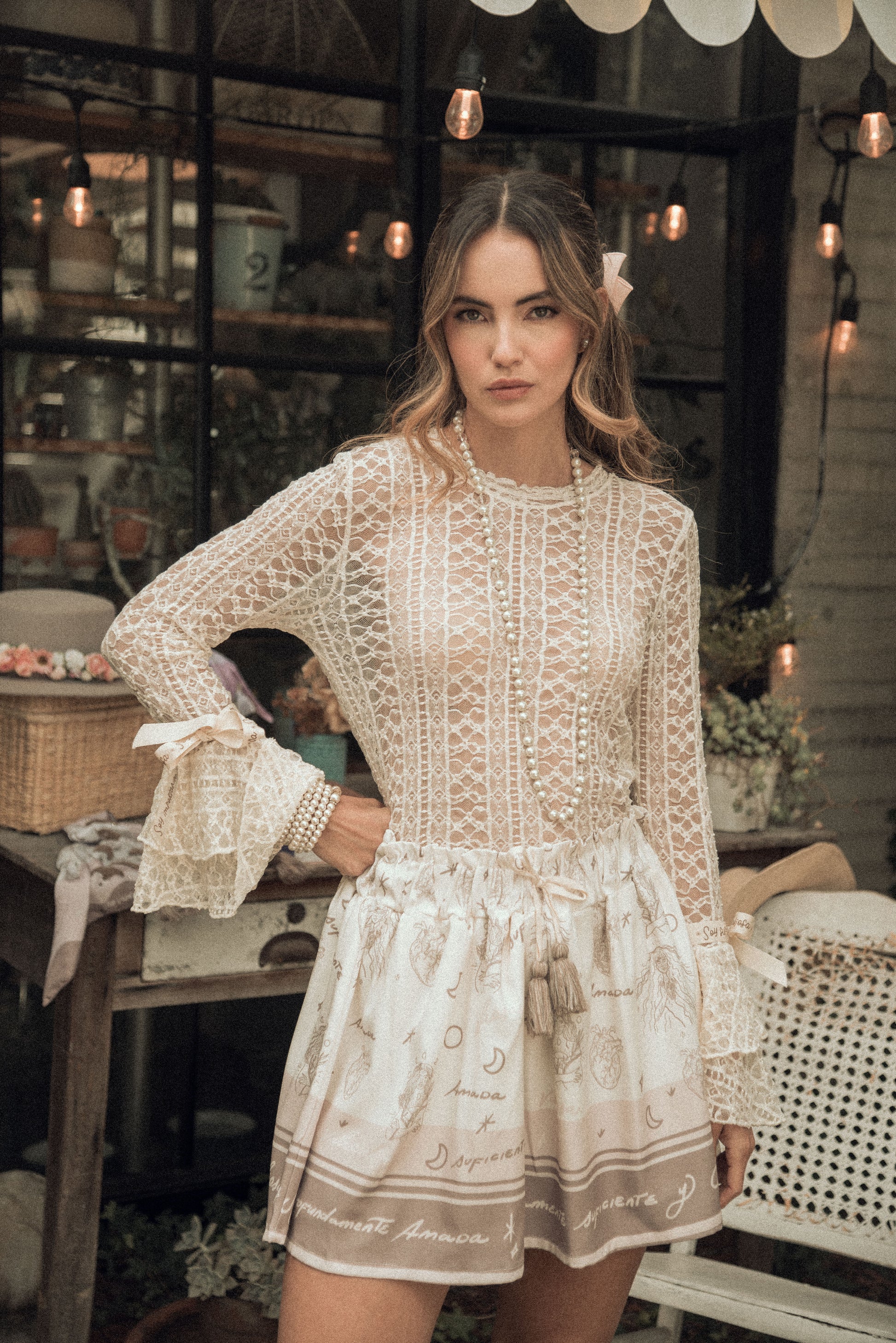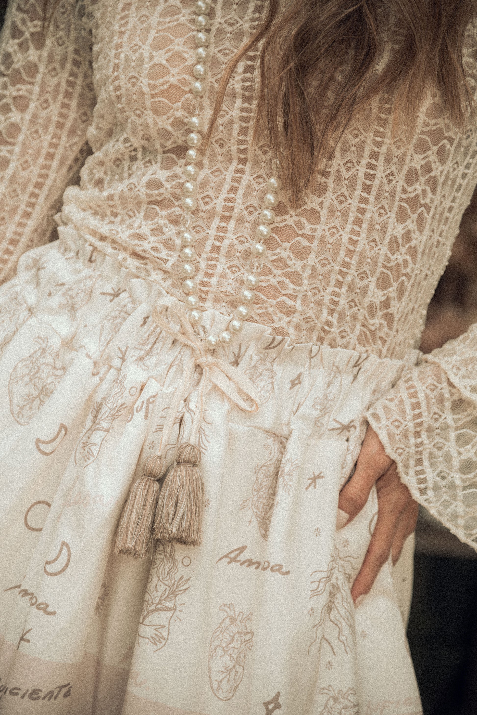 Falda corta en tela chi ón, sublimada con detalles lila pretina en resorte cinta en hiladilla con borlas hechas a mano.