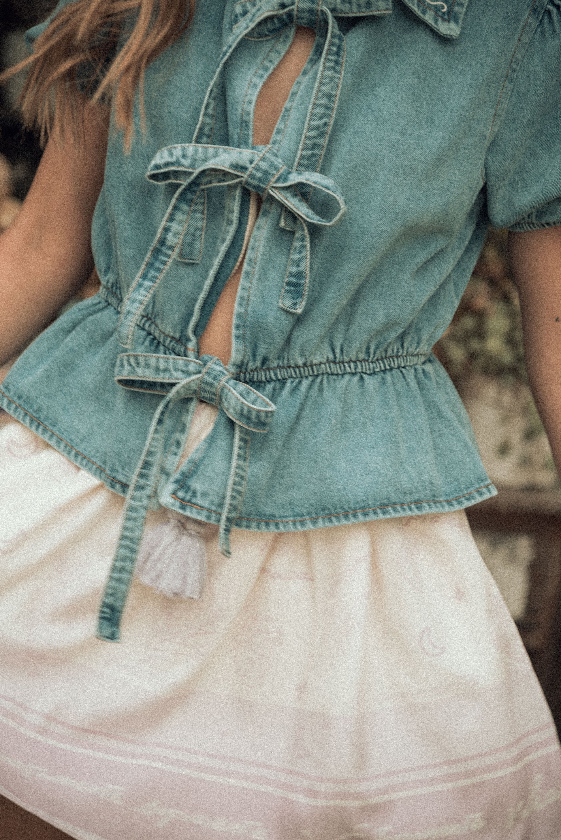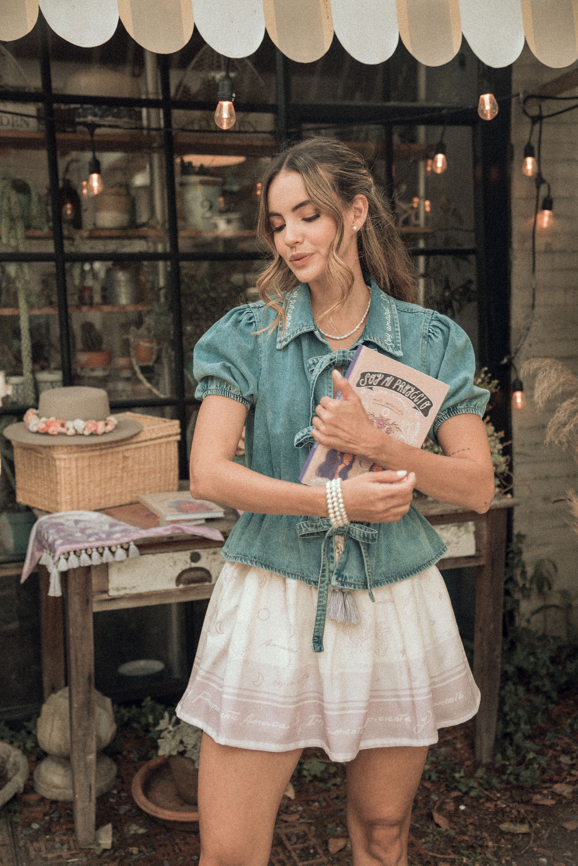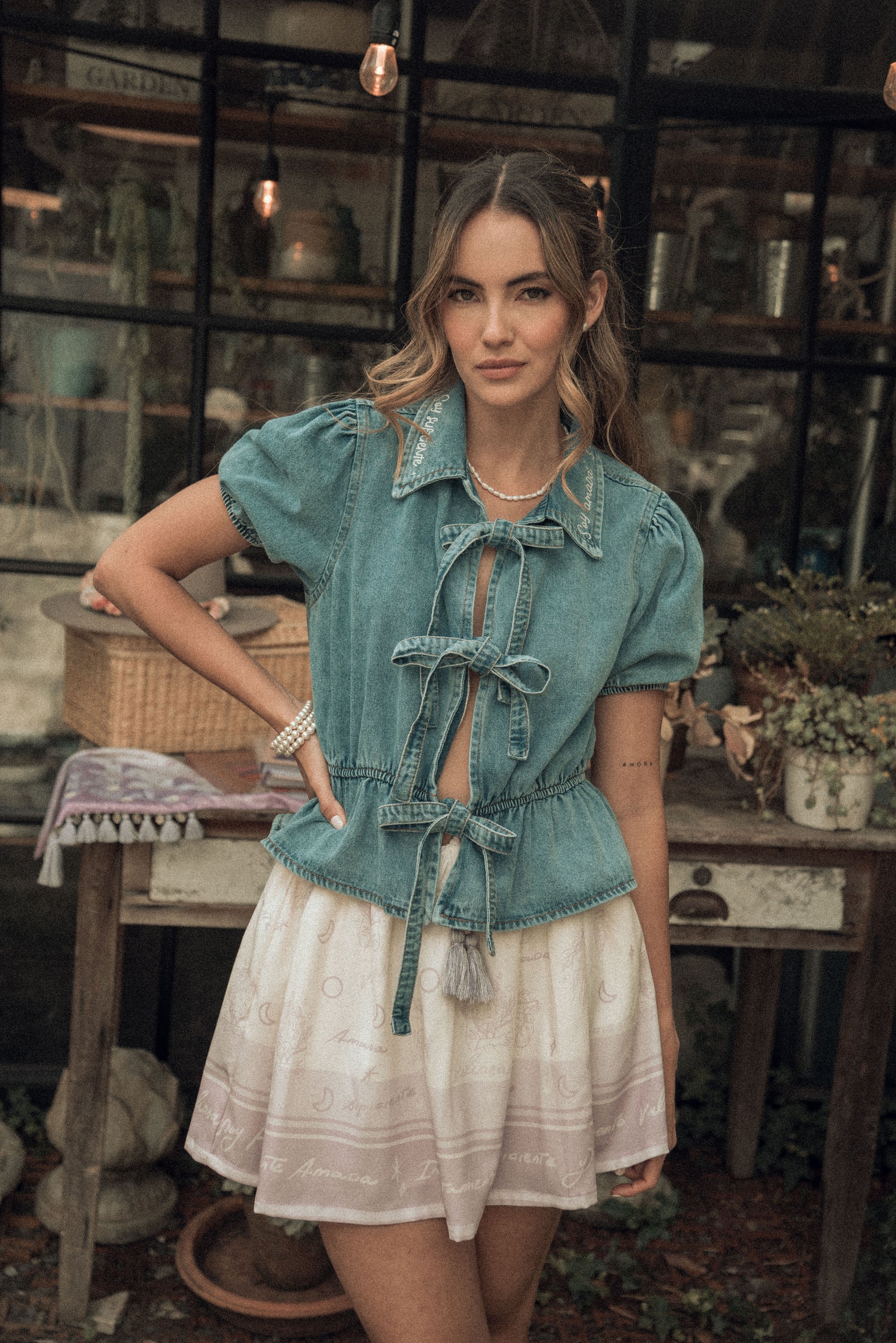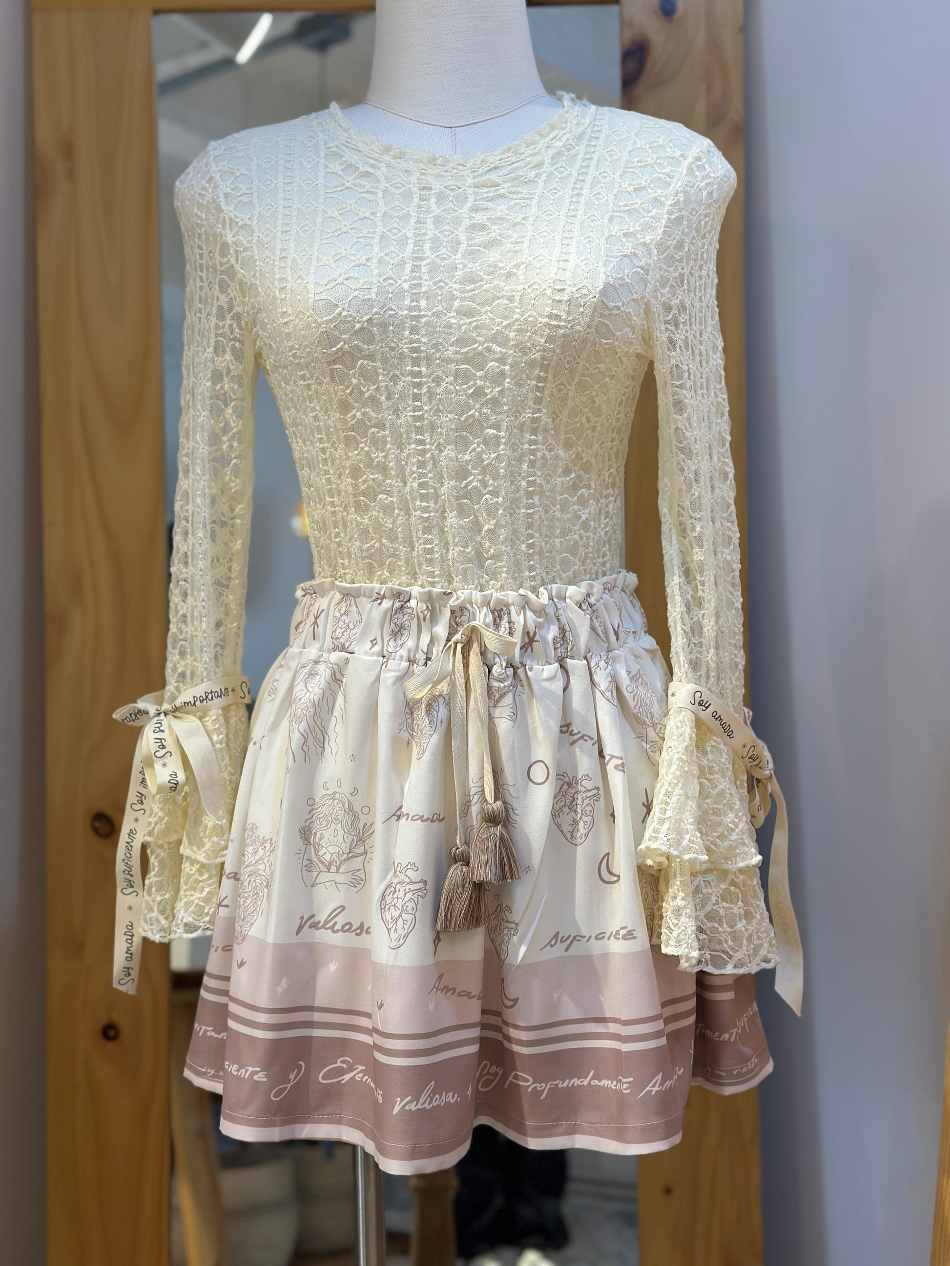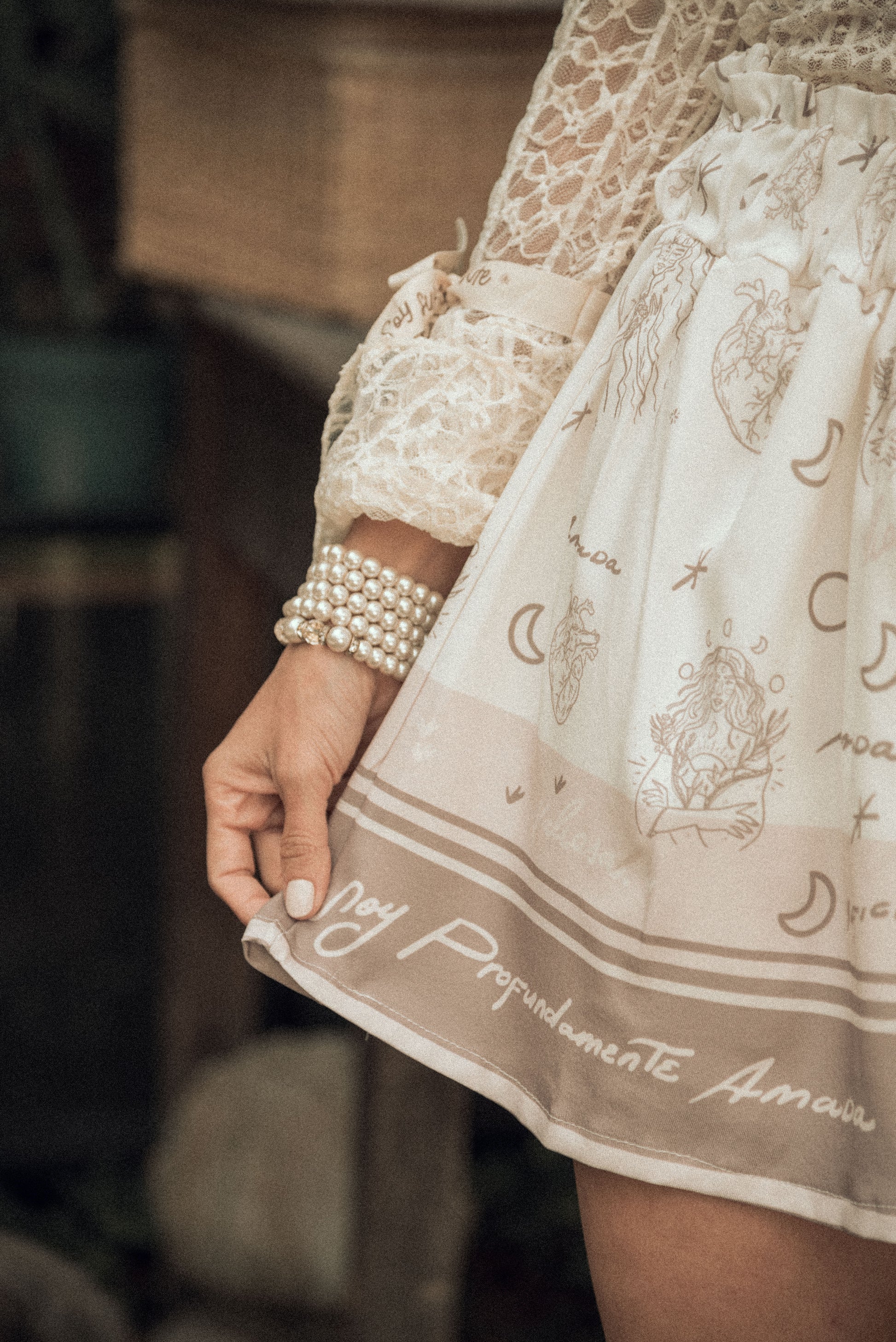 Falda corta en tela chi ón, sublimada con detalles lila pretina en resorte cinta en hiladilla con borlas hechas a mano.