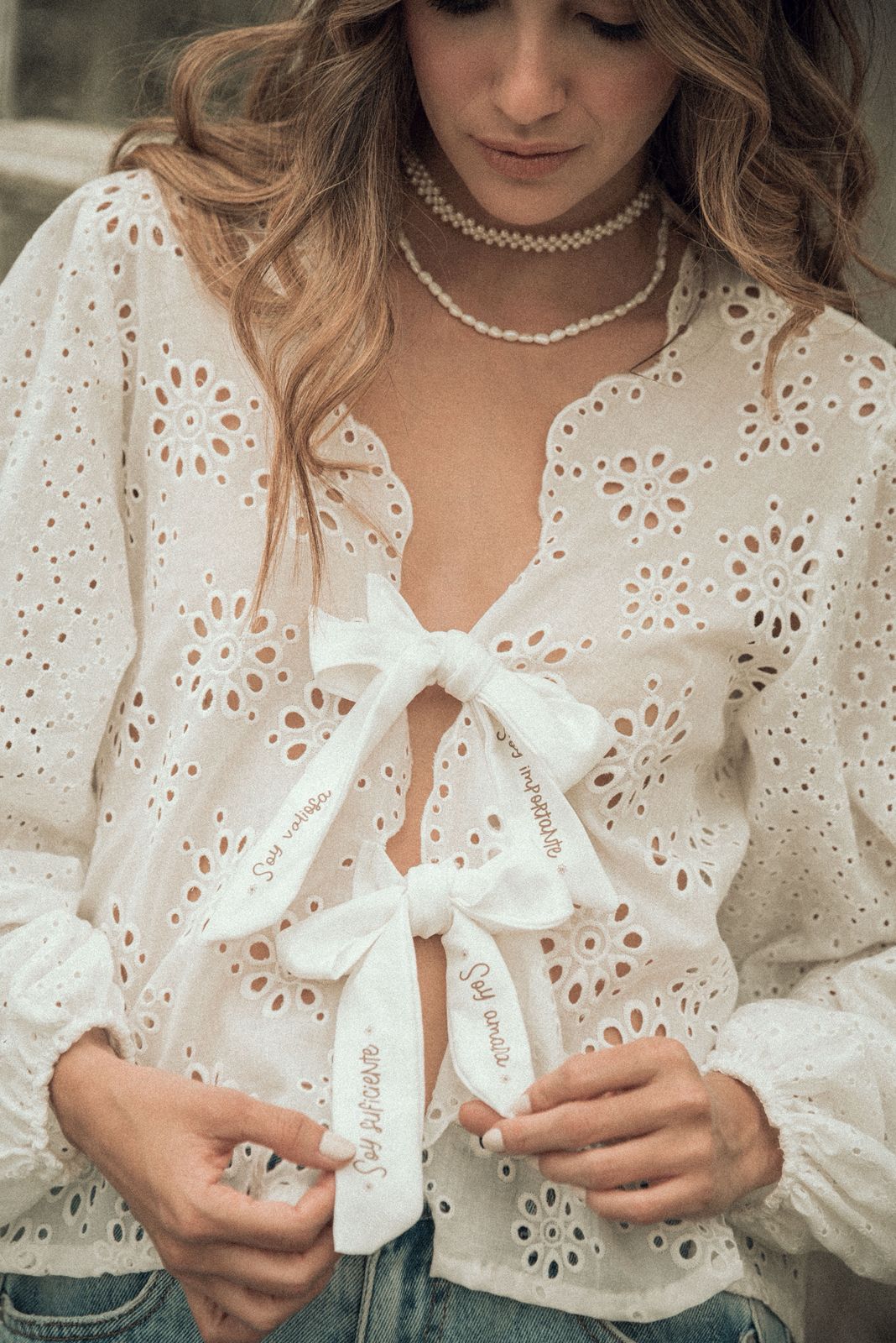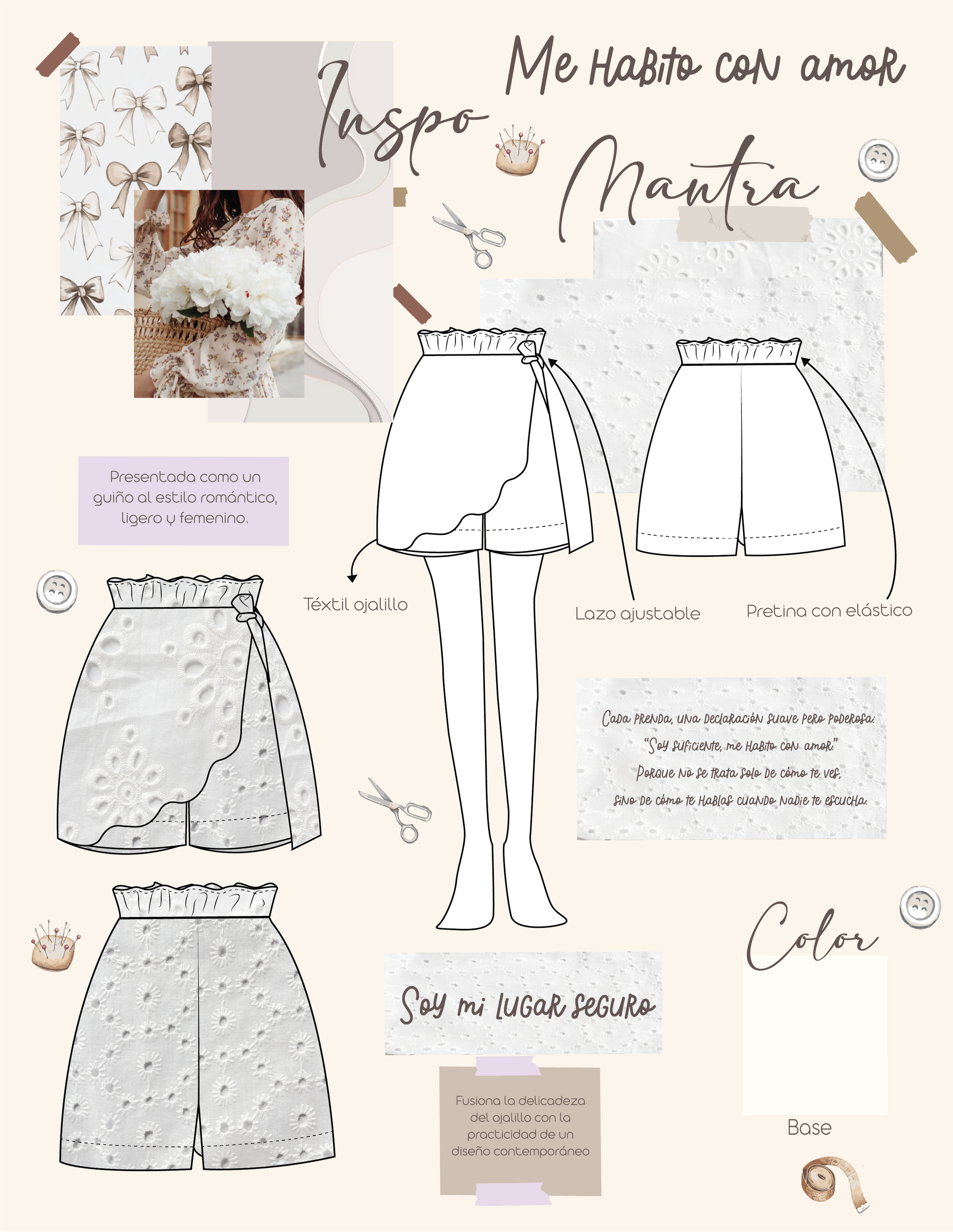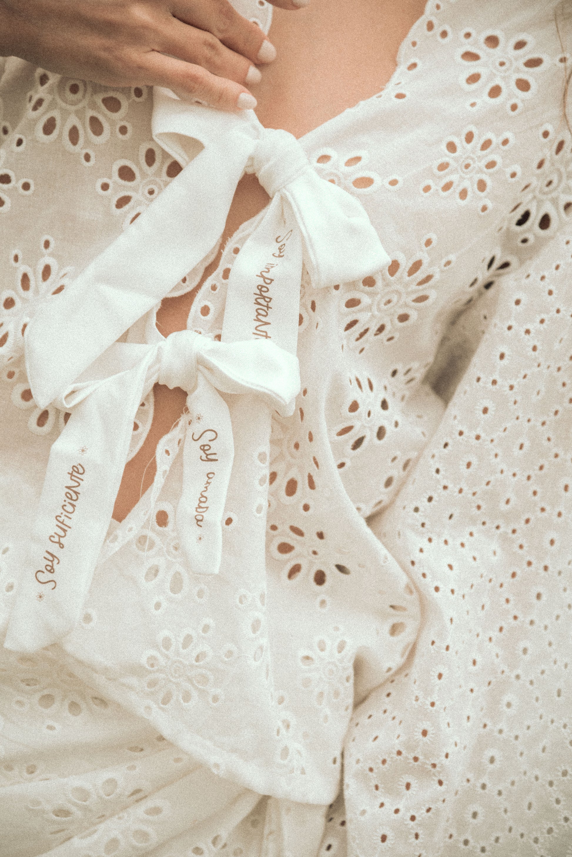 Set de ojalillo, 100% algodón, blusa manga larga con lazos frente estampados con frases: soy su ciente, soy valiosa, soy amada. Falda short corta, con amarre ajustable al costado, pretina con resorte.