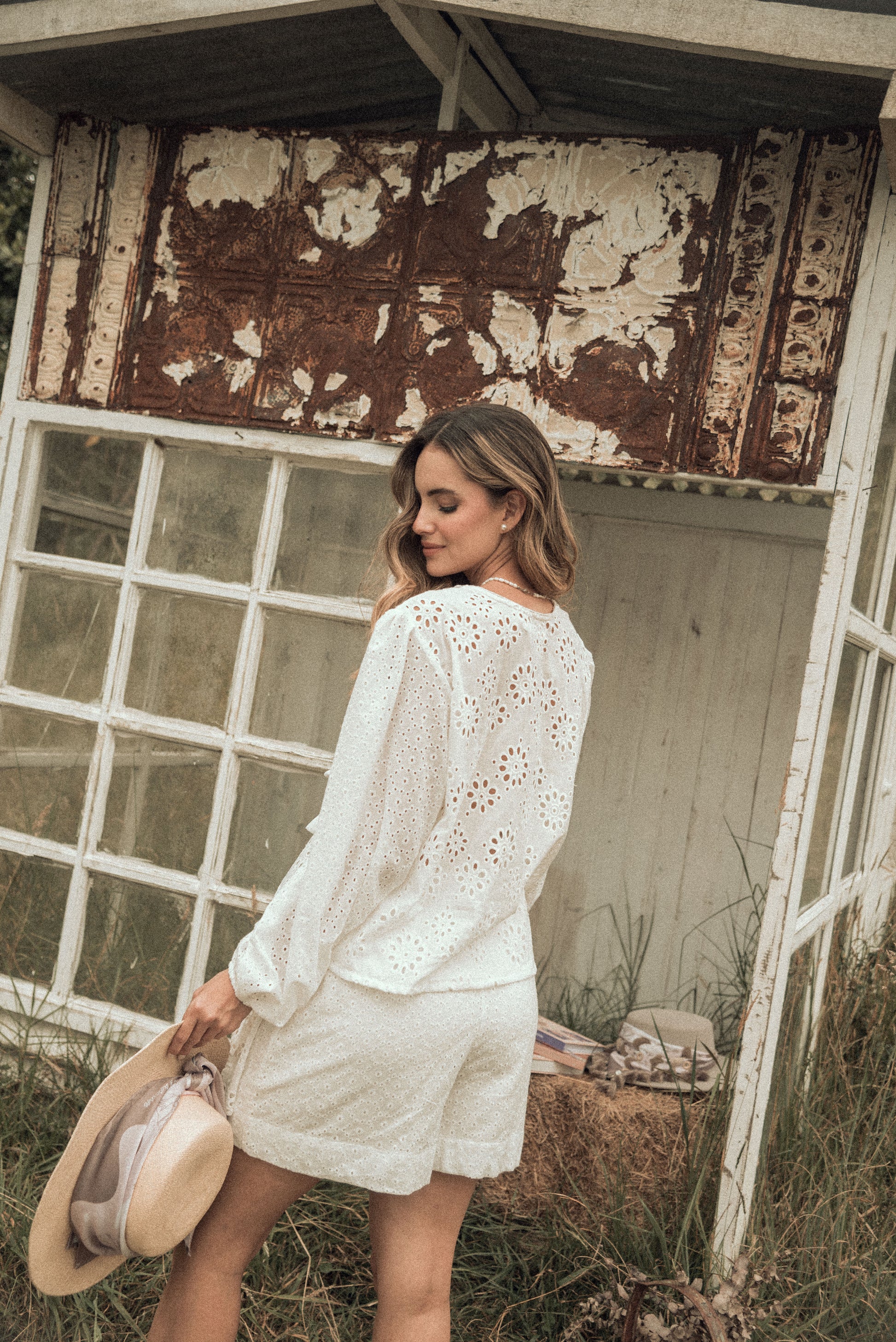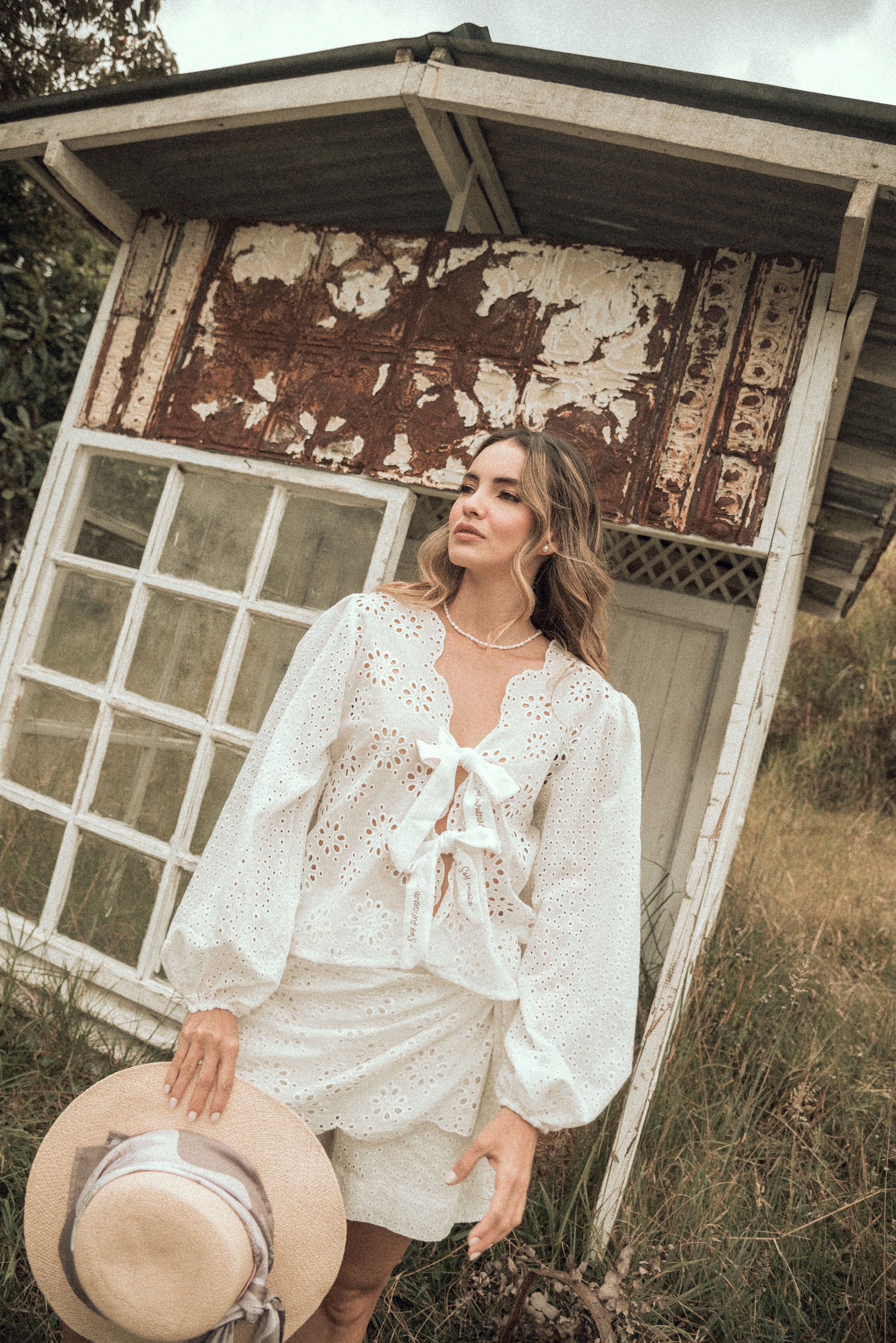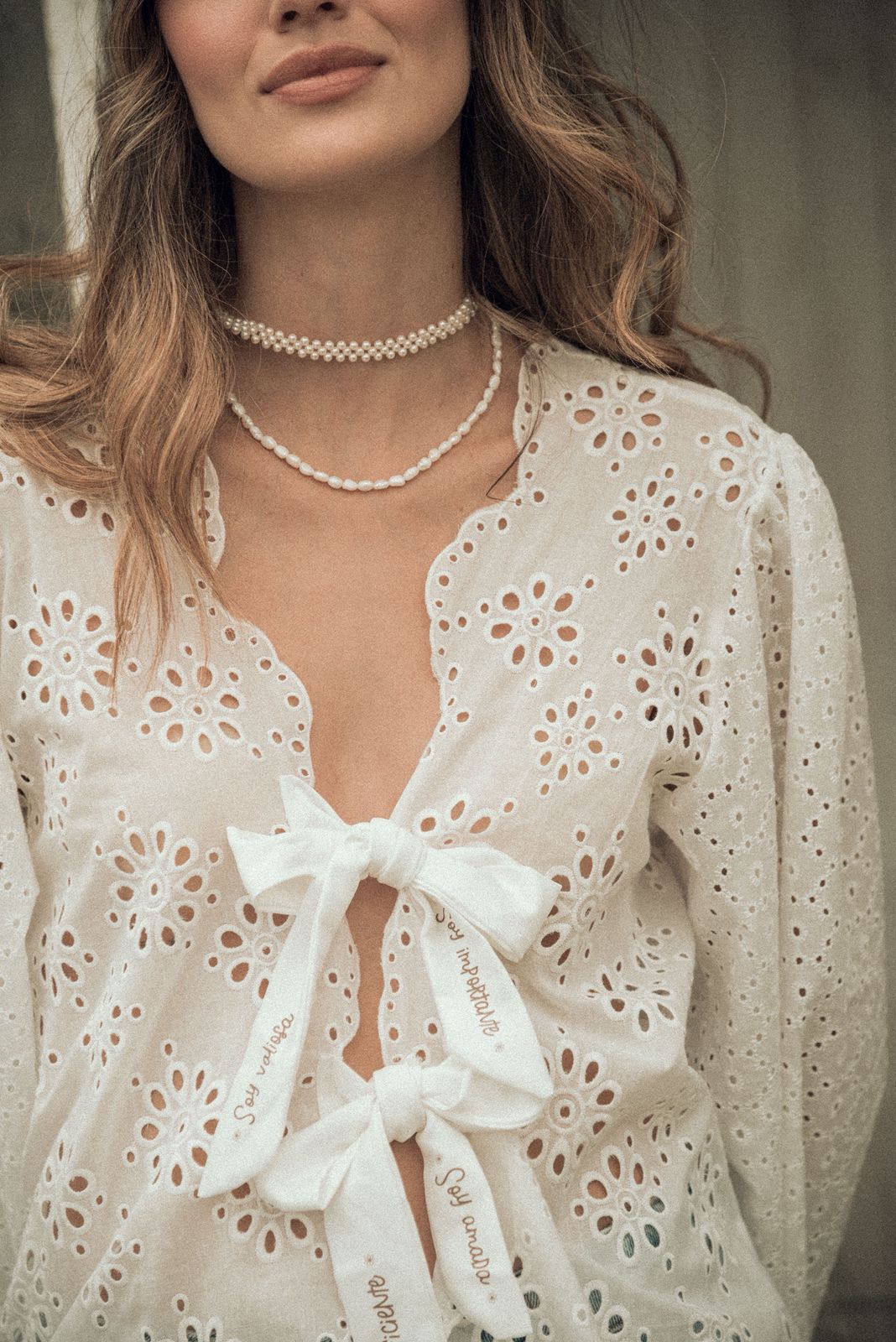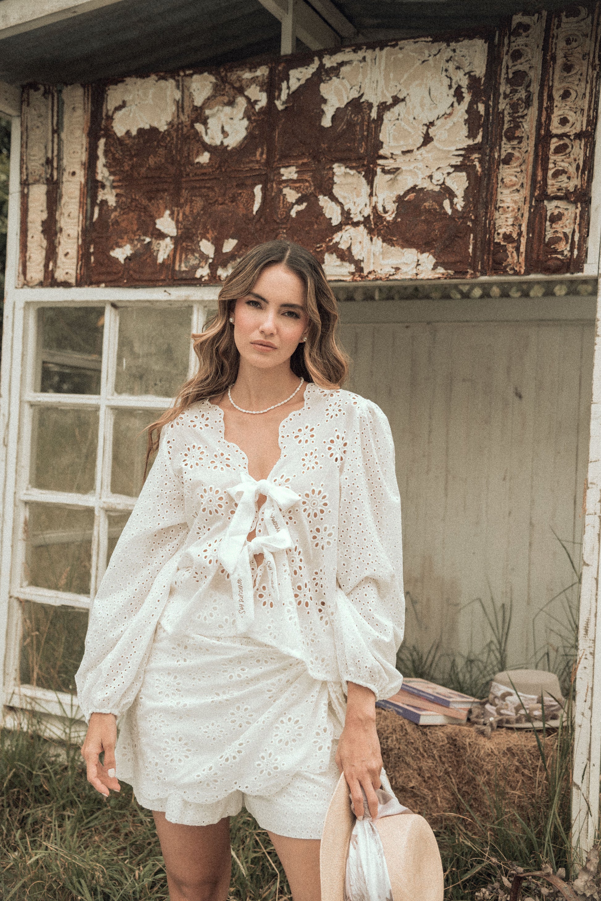 Set de ojalillo, 100% algodón, blusa manga larga con lazos frente estampados con frases: soy su ciente, soy valiosa, soy amada. Falda short corta, con amarre ajustable al costado, pretina con resorte.