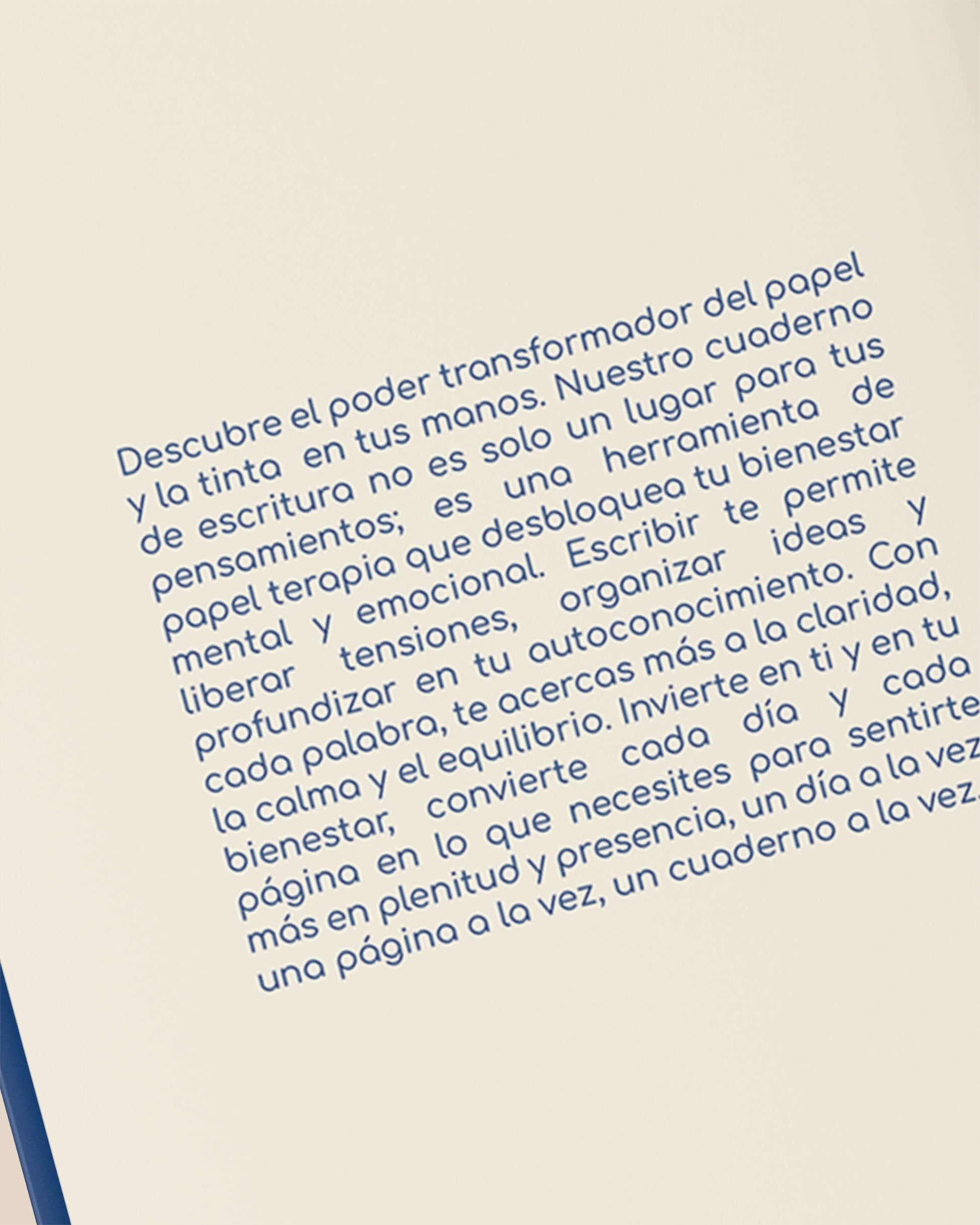 Descubre el poder transformador del papel y la tinta en tus manos. Nuestro cuaderno de escritura no es solo un lugar para tus pensamientos; es una herramienta de papel terapia que desbloquea tu bienestar mental y emocional. Escribir te permite liberar tensiones, organizar ideas y profundizar en tu autoconocimiento. Con cada palabra, te acercas más a la claridad, la calma y el equilibrio. Invierte en ti y en tu bienestar, convierte cada día y cada página en lo que necesites para sentirte más en plenitud y presencia, un día a la vez, una página a la vez, un cuaderno a la vez.
