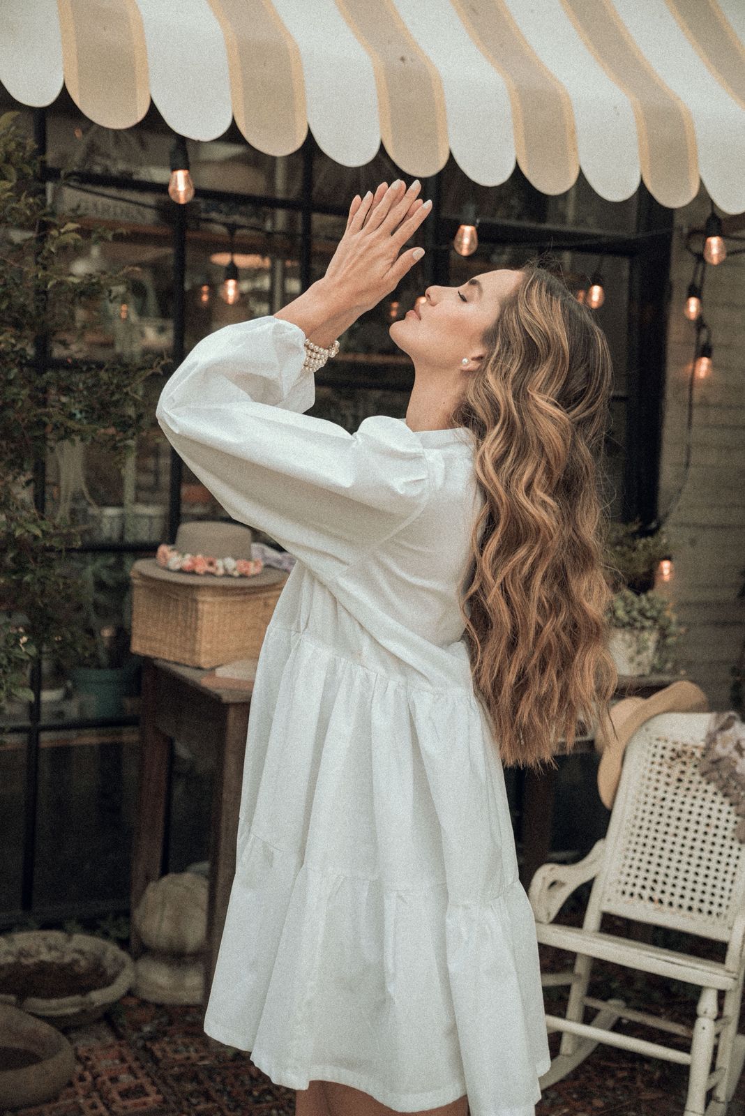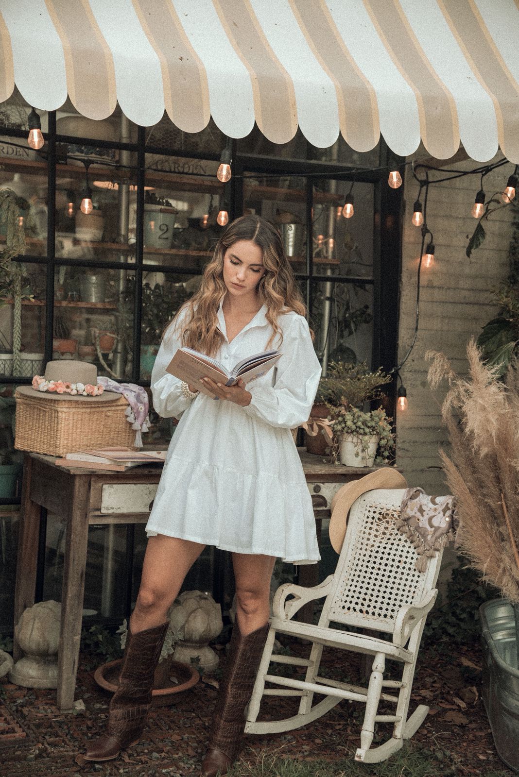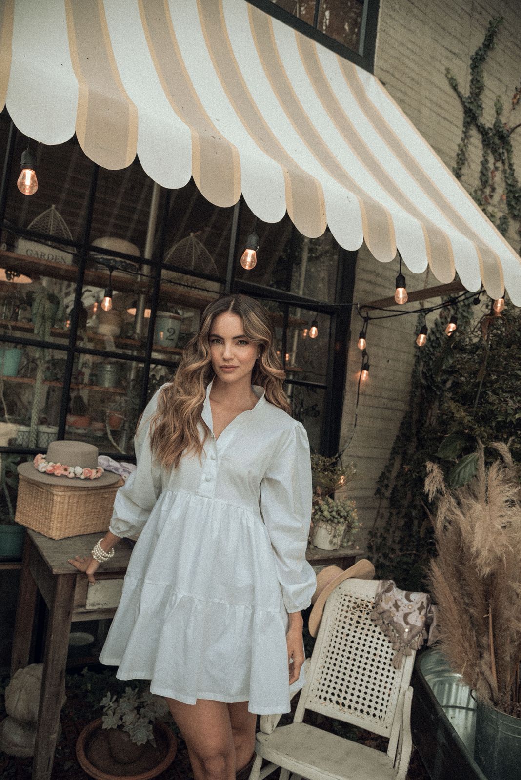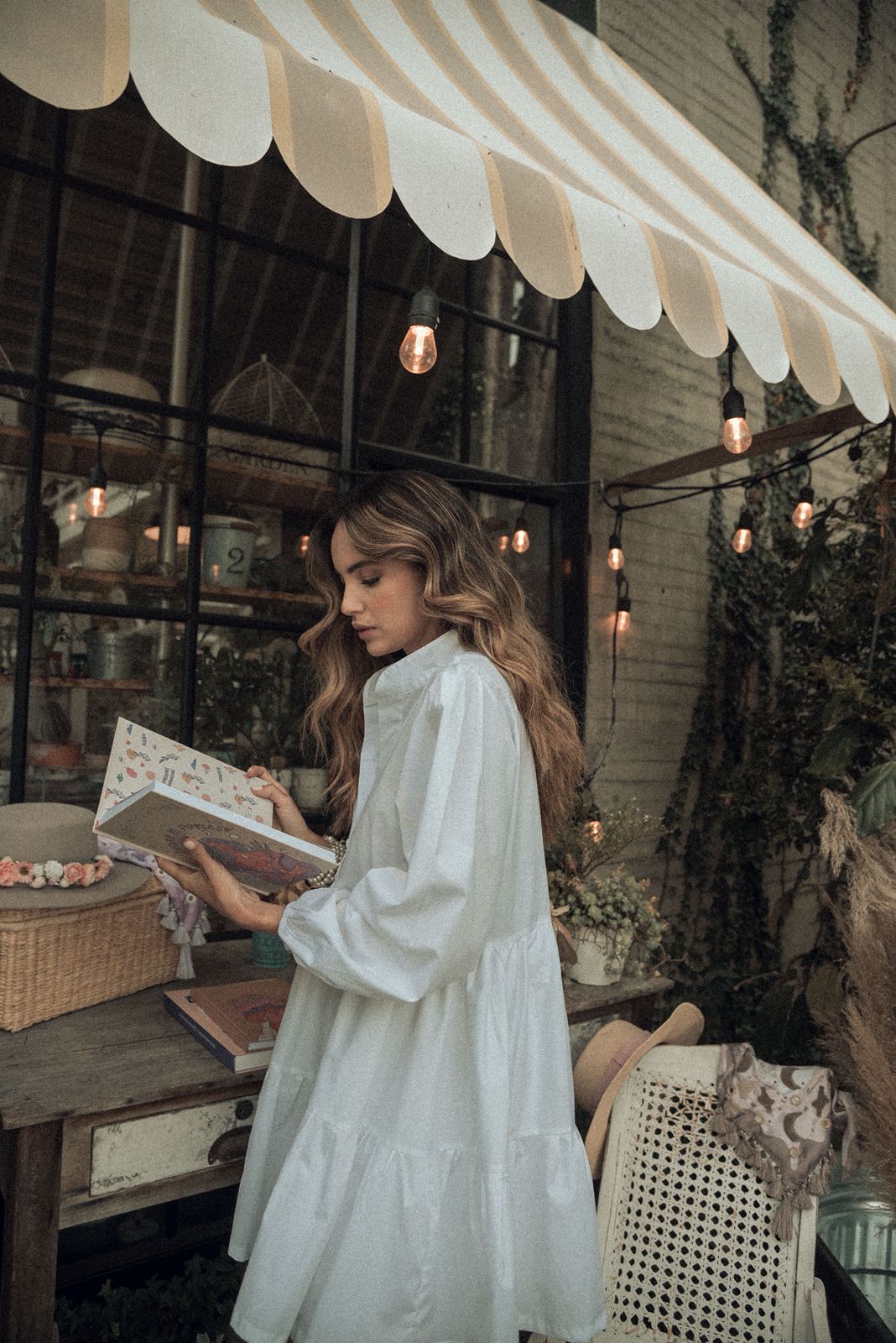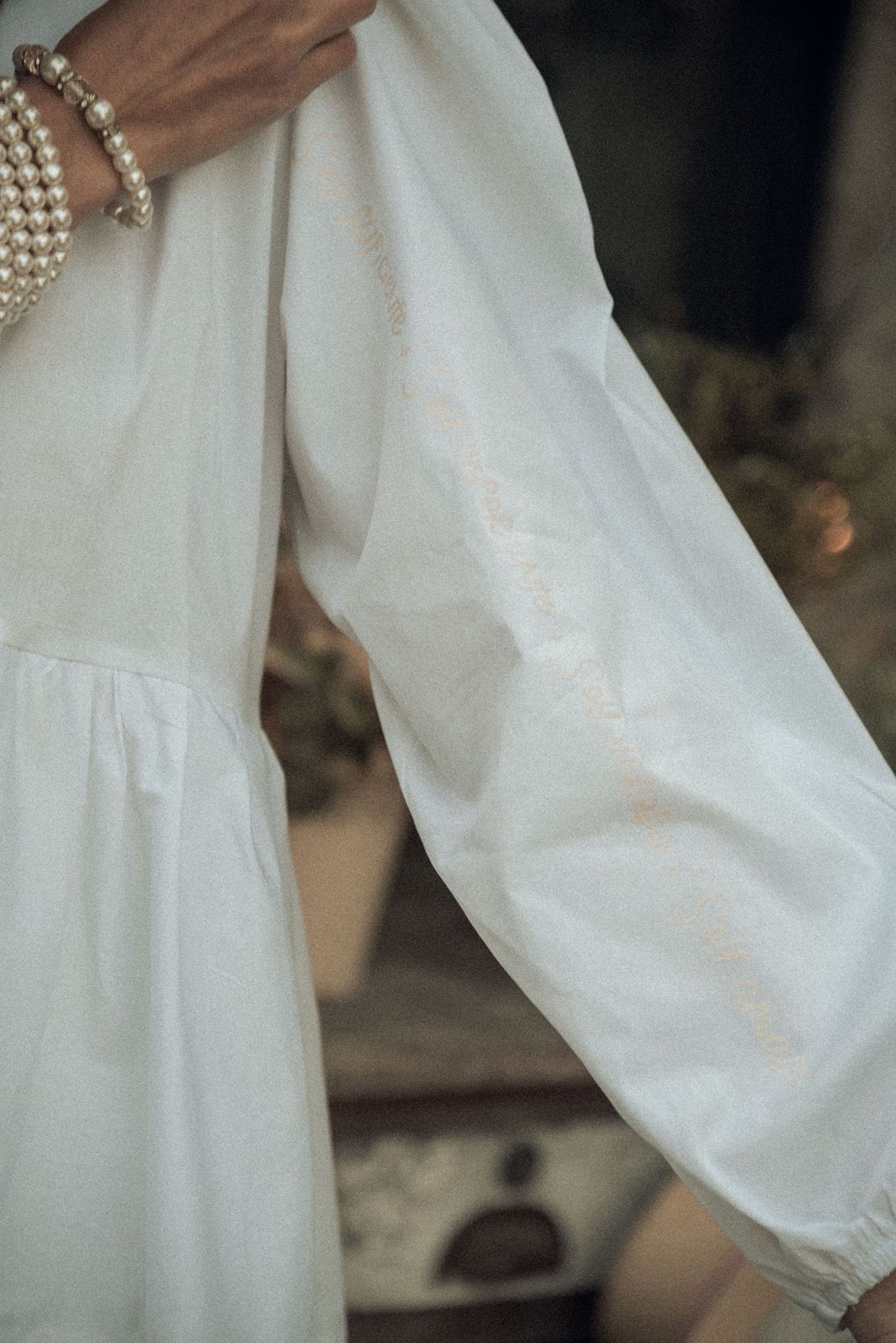 Vestido en tela popelina, falda en tiempos, con mangas amplias y estampado alma violeta, cuello nerú.